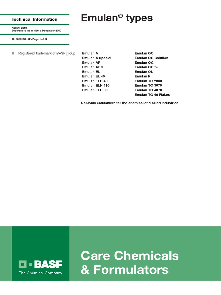 Properties emulan p emulan oc solution emulan to 2080 emulan to 3070 and emulan to 4070 are clear colourless liquids. The emulan types are emulsifiers for the preparation of stable oil in water and water in oil emulsions.
