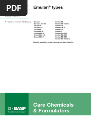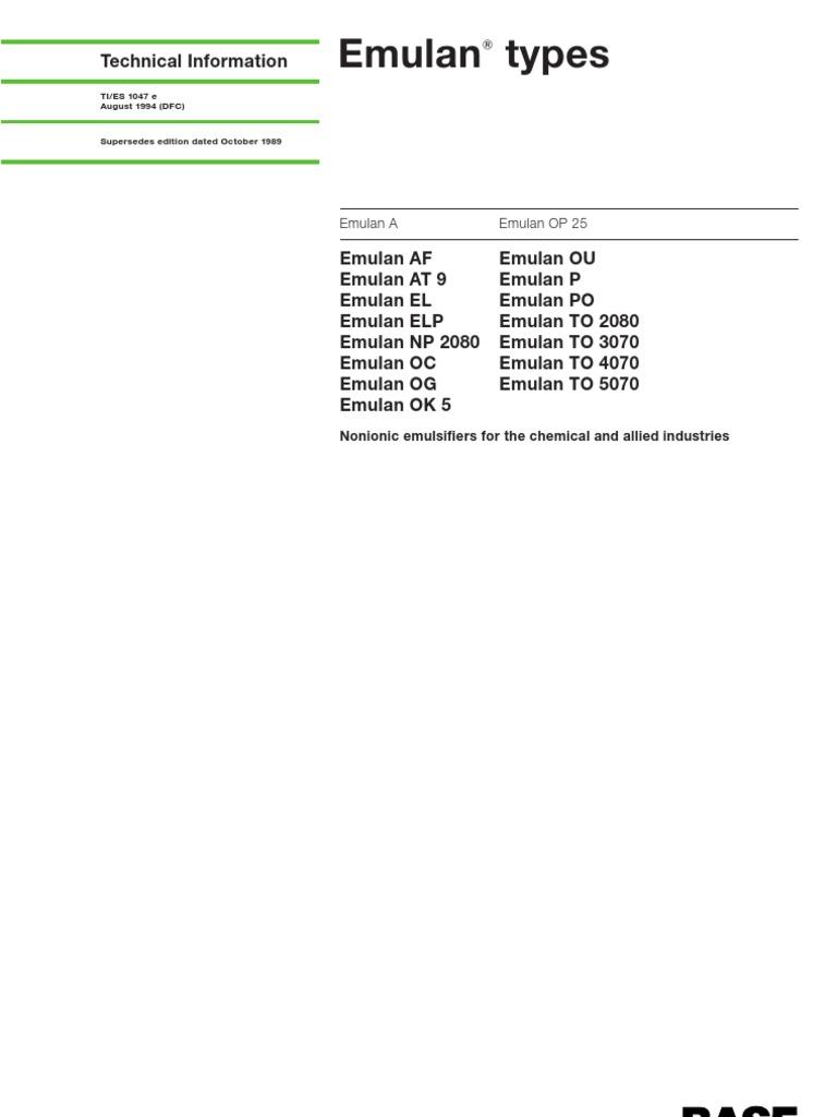 The emulan types are emulsifiers for the preparation of stable oil in water and water in oil emulsions. 34021300 free of charge emulan af raw material for the chemical technical industry for rd purpose. Emulan to 2080 c 13 oxo alcohol 20 eo disponil sds g80 93b emulan to 3070 c 13 oxo alcohol 30 eo 70 92b emulan to 4070 c 13 oxo alcohol 40 eo 70 92b special surfactants product chemical nature eo concen.
